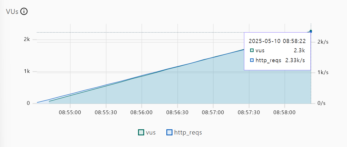 - 아래 그림에서는 나오지 않지만, http_reqs가 위처럼 vus와 같은 기울기로 나아가는 것이 아닌, http_reqs가 더 이상 증가하지 않을 때가 있는데, 이는 서버에 대한 최대 throughput을 의미한다. 이처럼 최대 throughput에 다다를 경우, 서버가 처리해야 할 요청이 밀림으로써 Latency도 늘어나는 걸 볼 수 있다.