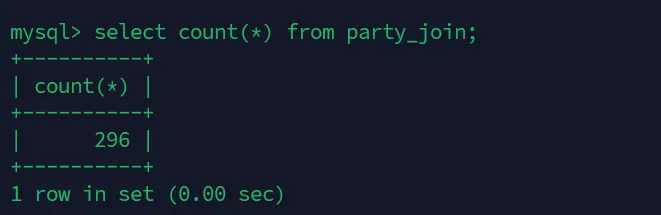각 부하 테스트 이후, DB에는 제대로 데이터가 들어갔나 RDS에 접속하니 FeignClient 테스트 중 데이터가 추가된 개수가 달랐다. 상단에서 http_reqs가 331이었고, 각 API 요청에 대해 party_join 대해 데이터가 하나씩 추가되지만 실제 추가된 수는 151개였다.