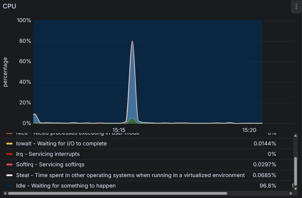 사용한 k6 script는 다음과 같다. 선착순 API이므로 짧은 시간 (10s) 내에 진행되도록 했고, 250 vu/10s 시나리오로 부하 테스트 진행 시 Node Exporter 대시보드 내 CPU 사용량이 약 6~70% 정도로 CPU 병목이 되지 않는 선에서 진행하기 위해 선정했다.
