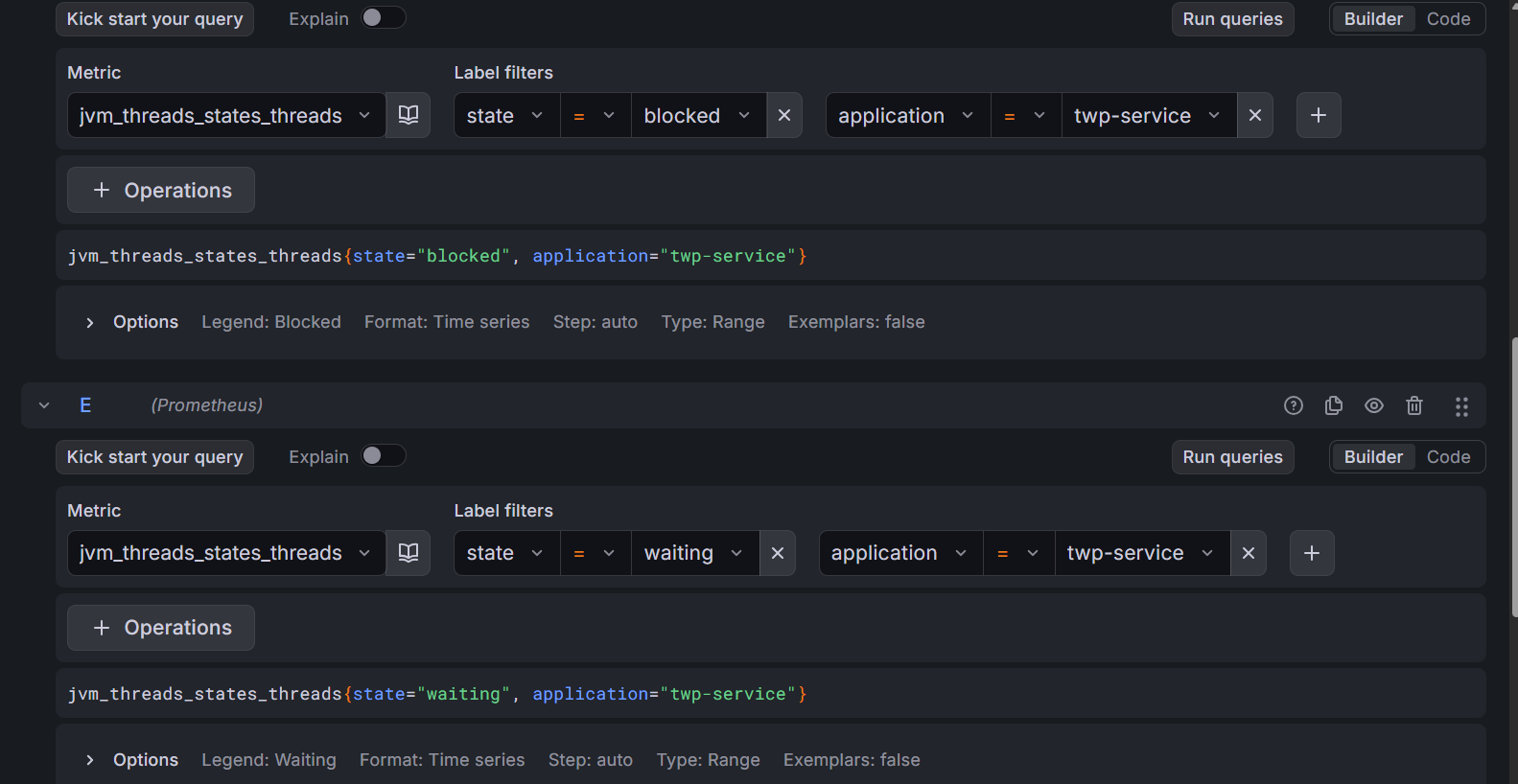 관련 이슈 해결 후 Threads 패널로 가 보니, 부하 테스트 이전과 달리 Waiting threads의 수가 증가한 것을 확인할 수 있었다. 이를 기반으로 긴 waitTime 때문에 스레드가 불필요하게 대기 상태로 머물어 Latency가 길어진 것이 아닐까 생각해, 락 획득 시도 시간을 줄여보기로 했다.