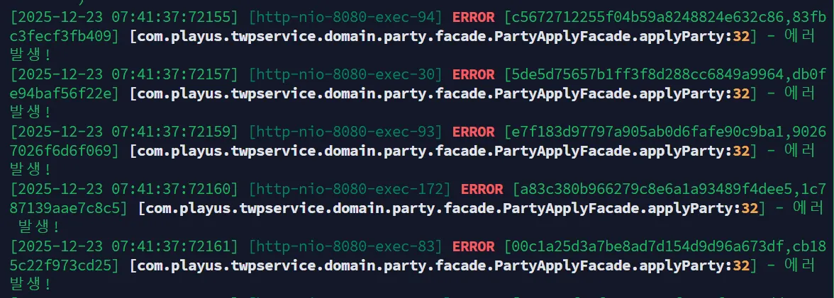 그 결과, 락을 획득하지 못해 에러 로그가 출력되는 것을 알 수 있었고, 부하 테스트 재시도 시 success_count와 party_join 내 record의 개수가 같은 것을 확인할 수 있었다.