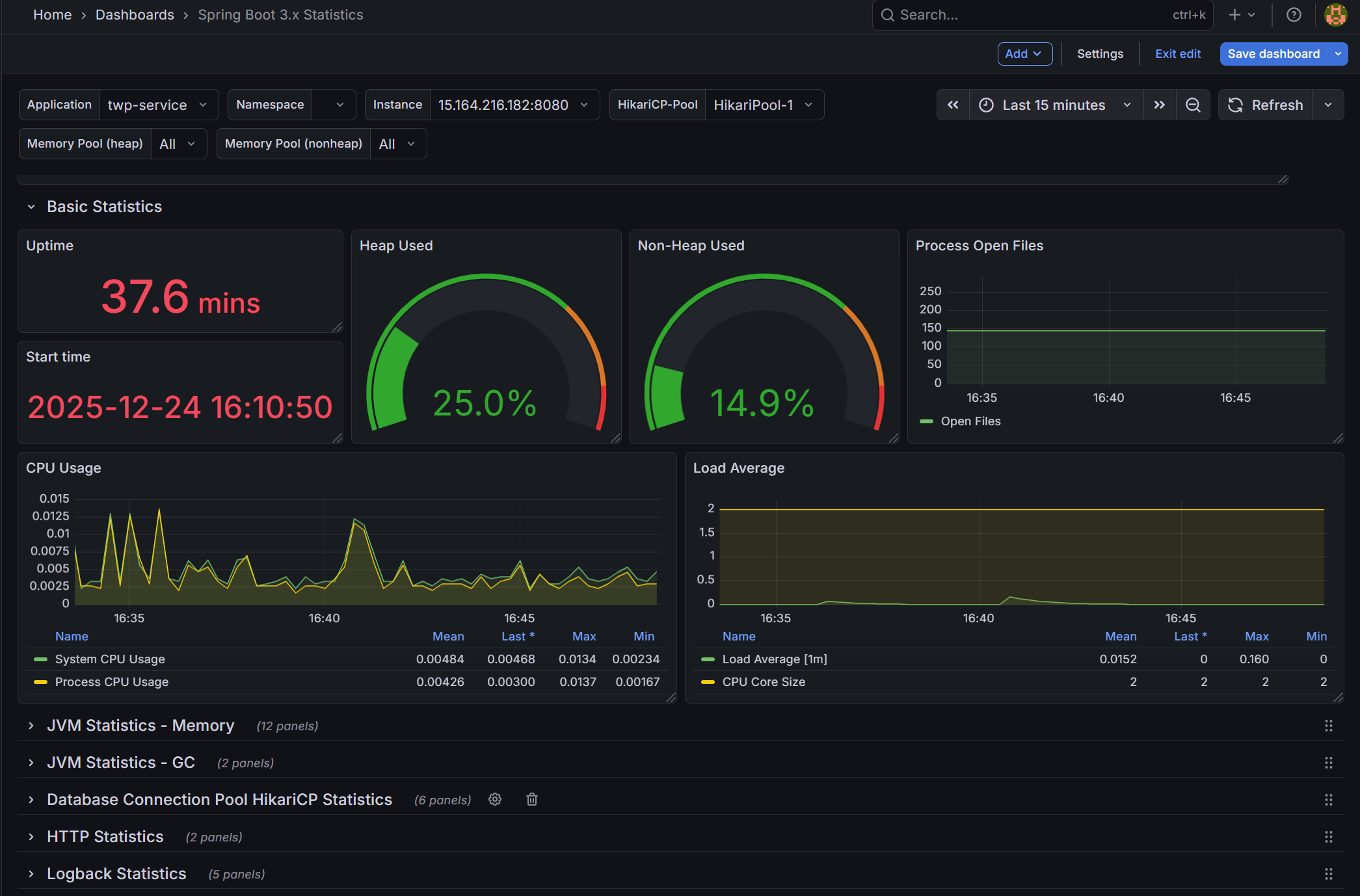 모니터링은 Prometheus + Grafana와 각 DB 내 모니터링 항목을 참조했다. 스프링 서버와 EC2의 상태를 동시에 보고 싶었기에 Node Exporter와 Spring Boot 3.x Statistics 대시보드를 활용하였다. (Prometheus 내 scrape_configs에 :8080/actuator/prometheus와 :9100을 추가해야 대시보드로 볼 수 있다.)