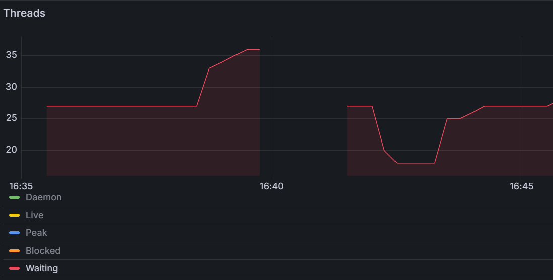 부하 테스트 재시도 후, waiting thread의 수도 줄어든 걸 확인할 수 잇엇다! (중간 docker rm 실행으로 그래프가 비어잇는 상태)