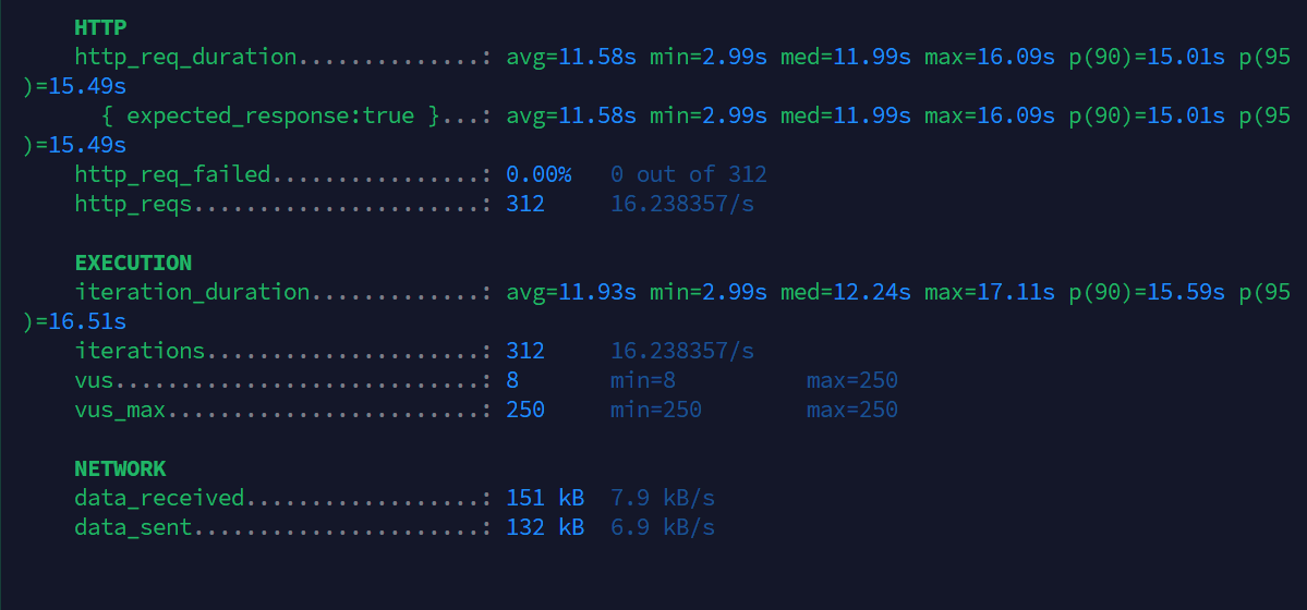 변경 후 다시 부하 테스트를 시도해본 결과, avg가 11초에서 2초대로 크게 줄은 것을 확인할 수 있다. 이에 더해 http_reqs도 초반 FeignClient의 300대에 비해 현재는 Latency가 줄어 1000까지 늘어난 것을 볼 수 있다.