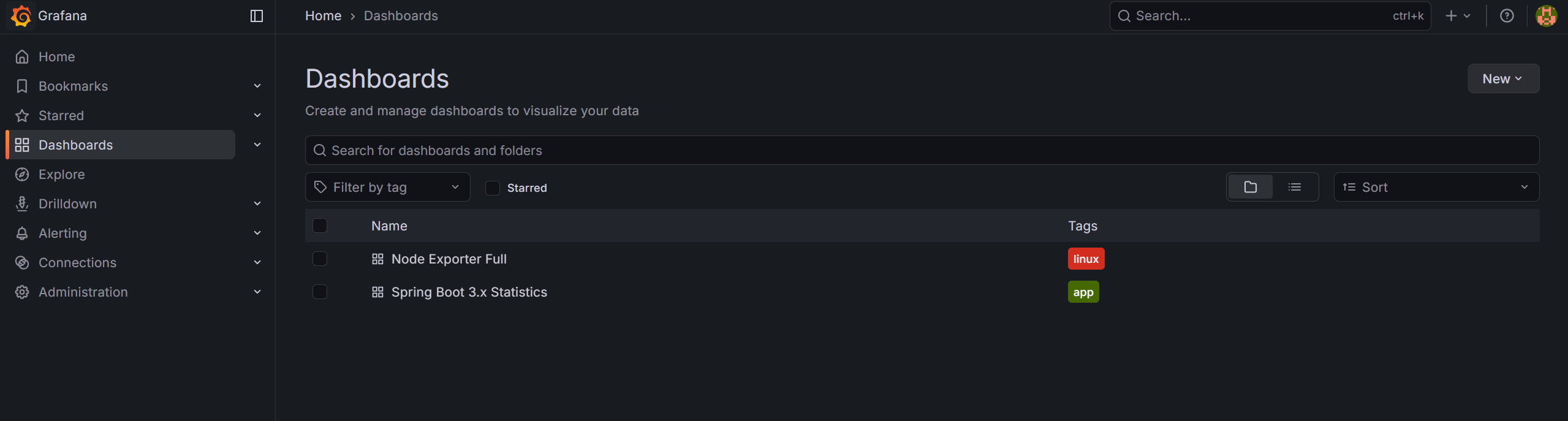 상단의 대시보드를 쓰고 싶다면 Home > Dashboards > 우상단 New의 2번째 칸에 Node Exporter Full은 1860, Spring Boot 3.x Statistics는 19004를 입력하면 된다.