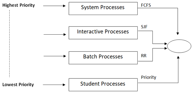 알고리즘은 간단합니다. priority가 같은 프로세스끼리 모아놓은 뒤, priority가 높은 프로세스들부터 지정된 Scheduling Algorithm을 통해 Scheduling을 하는 방식입니다. 위 예시의 경우 System Processes는 FCFS, Interactive Processes의 경우 SJF를 통해 Scheduling을 하고 있는 걸 알 수 있습니다.