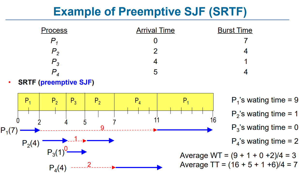 위 슬라이드는 Preemptive SJF(SRTF)의 예시입니다. Preemptive SJF의 경우, 특정 프로세스가 실행되어 있는 중
