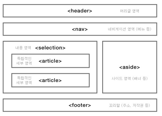 selectioning element 사용 방법 공통적으로 지켜야 할 룰 sectioning element 내에는 반드시 heading 태그가 있어야 함 ex) 제목 // heading tag ... heading tag를 적지 않아도 됨 4. section 논리적으로 완결된 집합체를 묶음 heading tag 필요 section vs div - section : 서로 연관된 데이터들을 하나로 묶을 때 - div : css, js 등을 위해 연관 없는 데이터를 묶을 때 5. article heading tag 필요 기사, 블로그, 트윗, feed 등 정보 컨텐츠에서 사용 6. aside heading tag 필요 sidebar, 광고, 작은 위젯 바에서 주로 사용 7. footer heading tag ..
